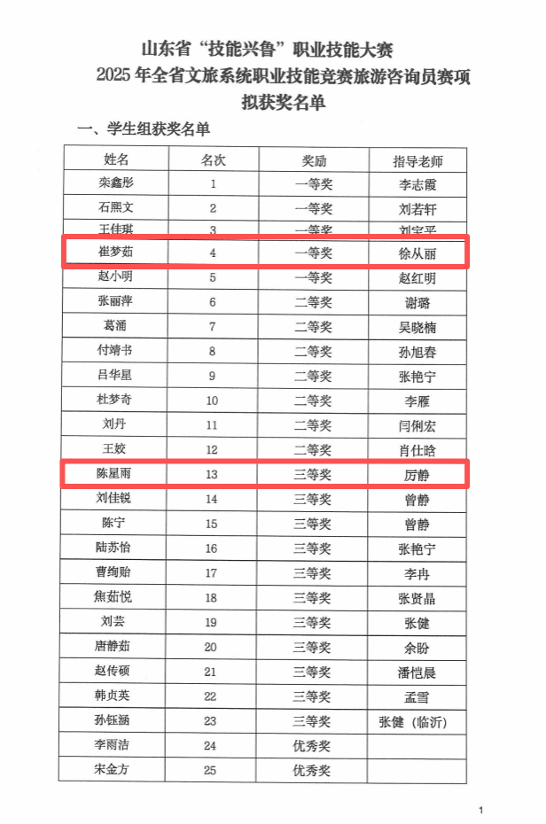 近日,由山东省人力资源和社会保障厅、山东省文化和旅游厅指导,山东文旅集团有限公司主办的山东省“技能兴鲁”职业技能大赛——2025年全省文旅系统职业技能竞赛旅游咨询员赛项圆满落幕。我院学生获一等奖和三等奖各1项,充分展示了我院在旅游服务类人才培养方面的扎实成效。