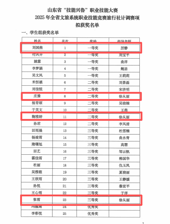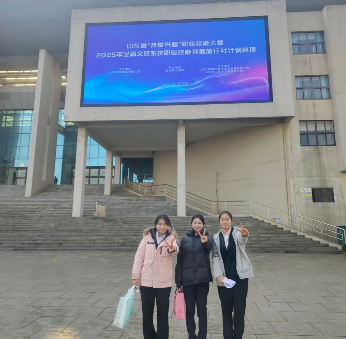 近日,由山东省人力资源和社会保障厅、山东省文化和旅游厅指导,山东文旅集团有限公司主办的山东省“技能兴鲁”职业技能大赛——2025年全省文旅系统职业技能竞赛计调赛项圆满结束。我院经济管理学院学生刘国燕获一等奖第一名、鞠雅婷、庄豫荣获二等奖、张雪获三等奖。
